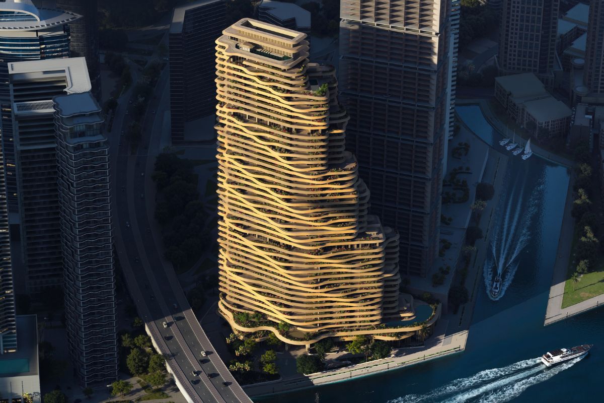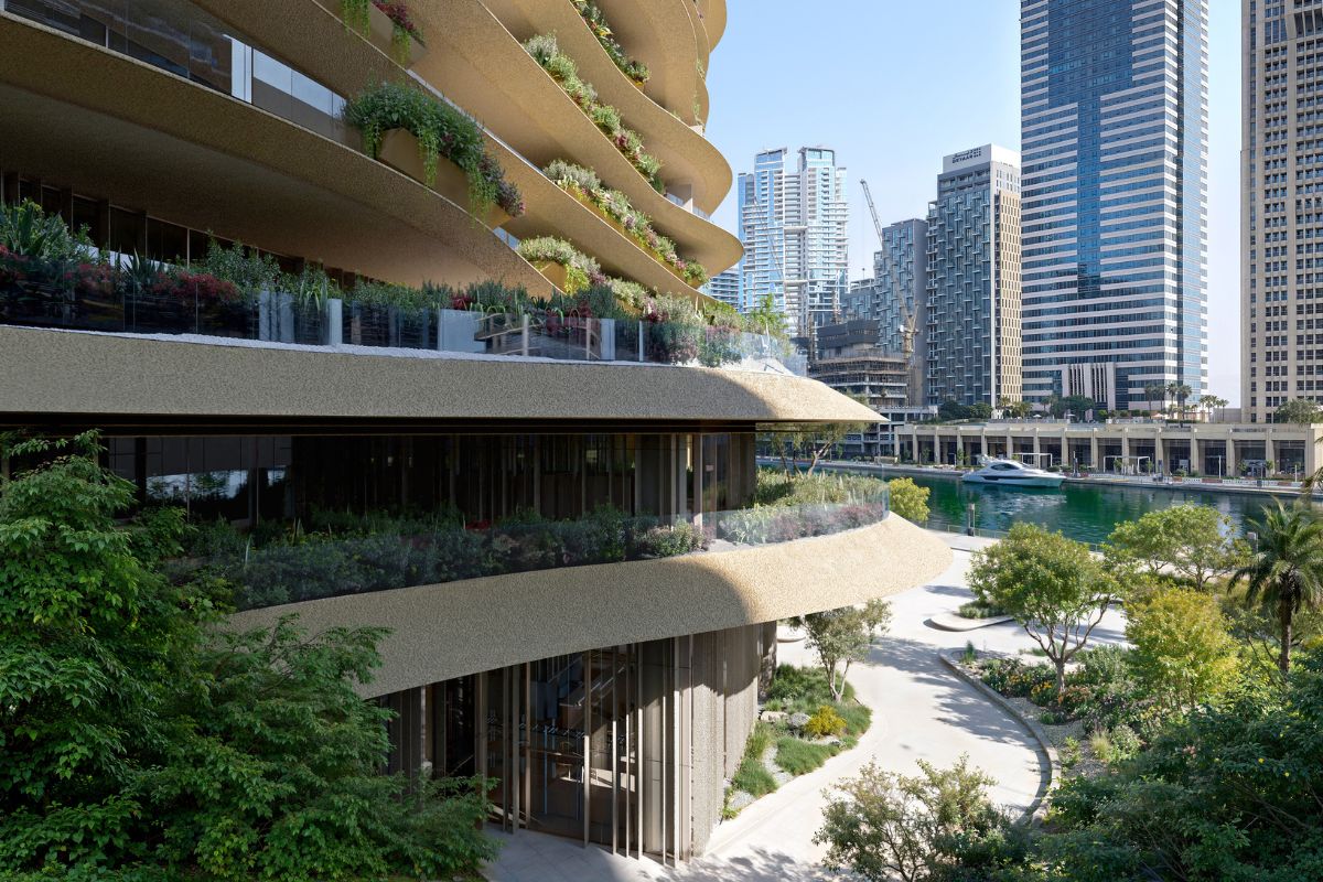 Designed by Kengo Kuma, marking his first residential project in the UAE, Wedyan soars 46 storeys above the Dubai Canal and comprises 149 residences with a mix of three-, four- and five-bedroom layouts, two full-floor penthouses and a three-storey Sky Villa. The façade, inspired by the movement of water and sand, features a layered and textured exterior that echoes the rhythm of the desert and valleys. The development offers more than 65,000 sq ft of amenity space, with landscaping realised in collaboration with Gustafson Porter + Bowman.