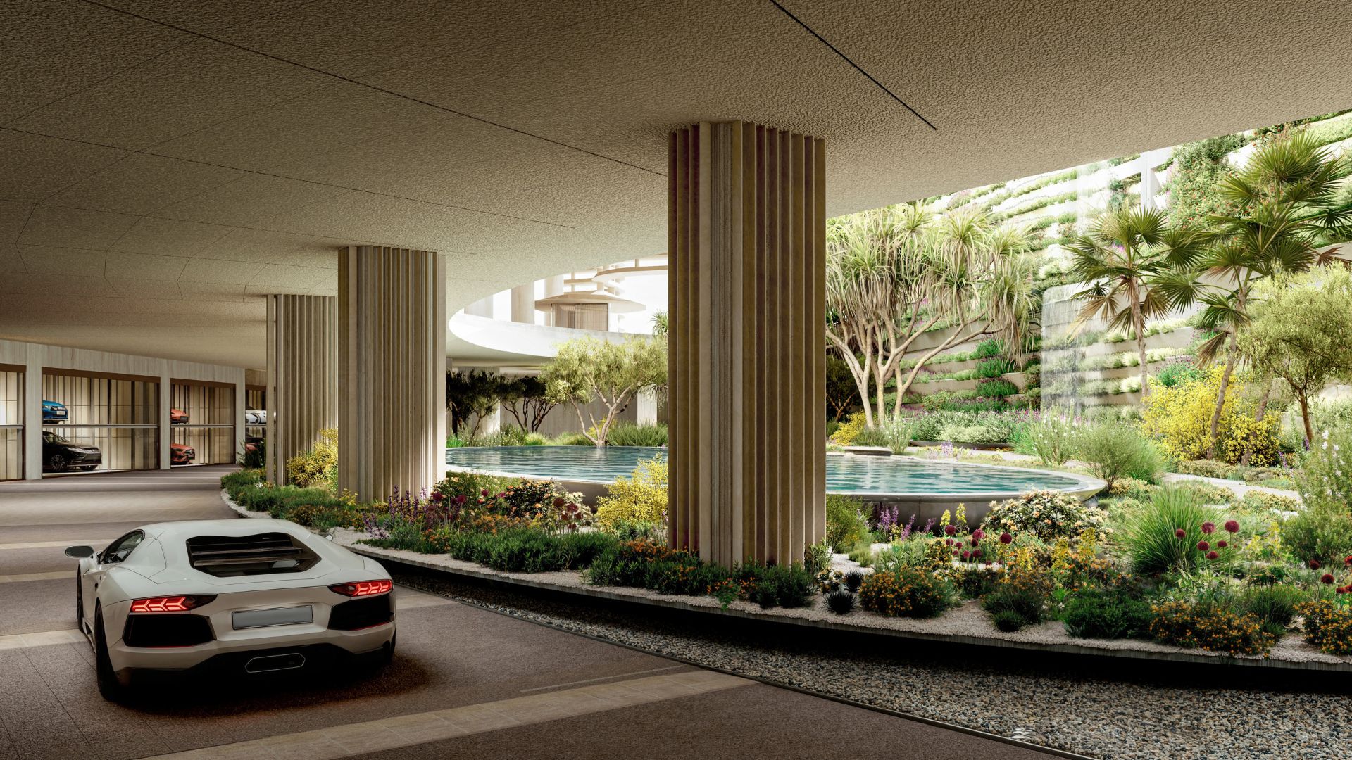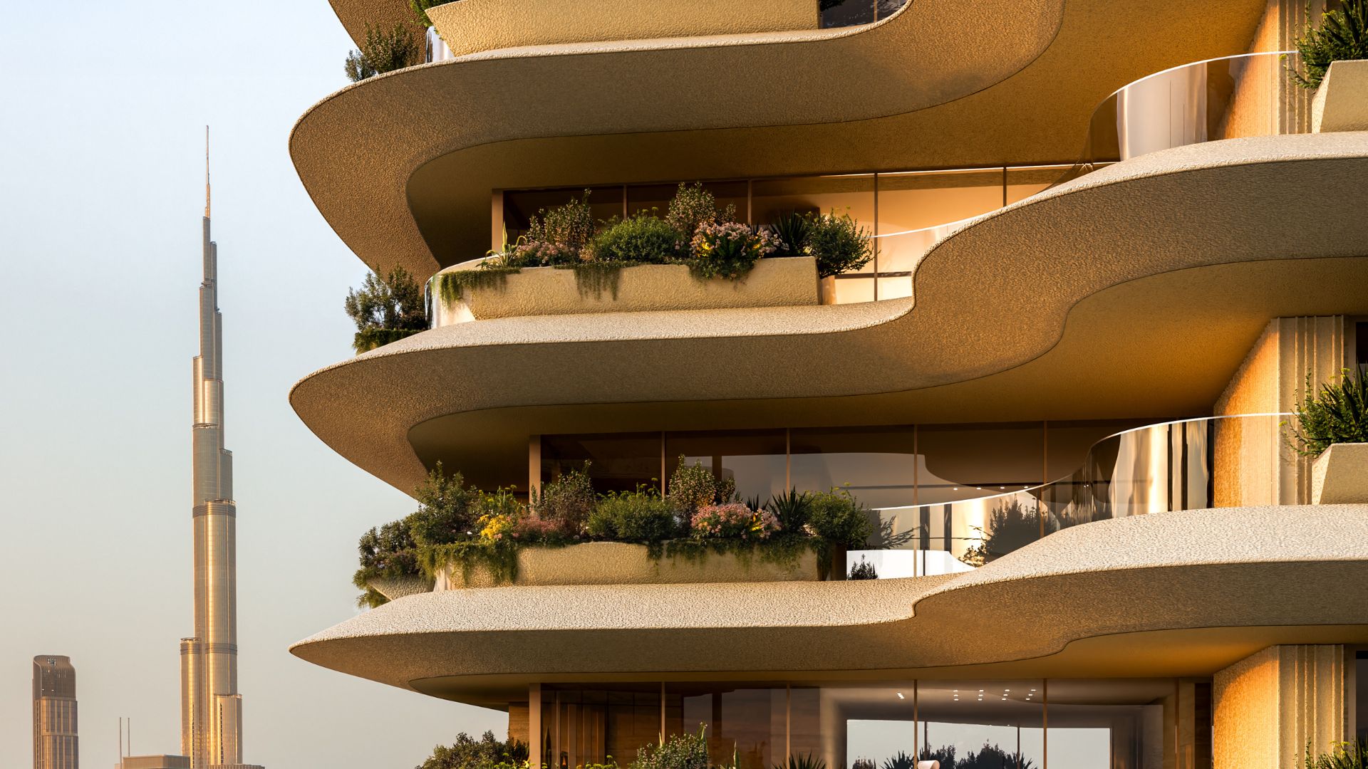 An incredible structure with cascading shades of sand and green, making the boundary between architecture and nature disappear.